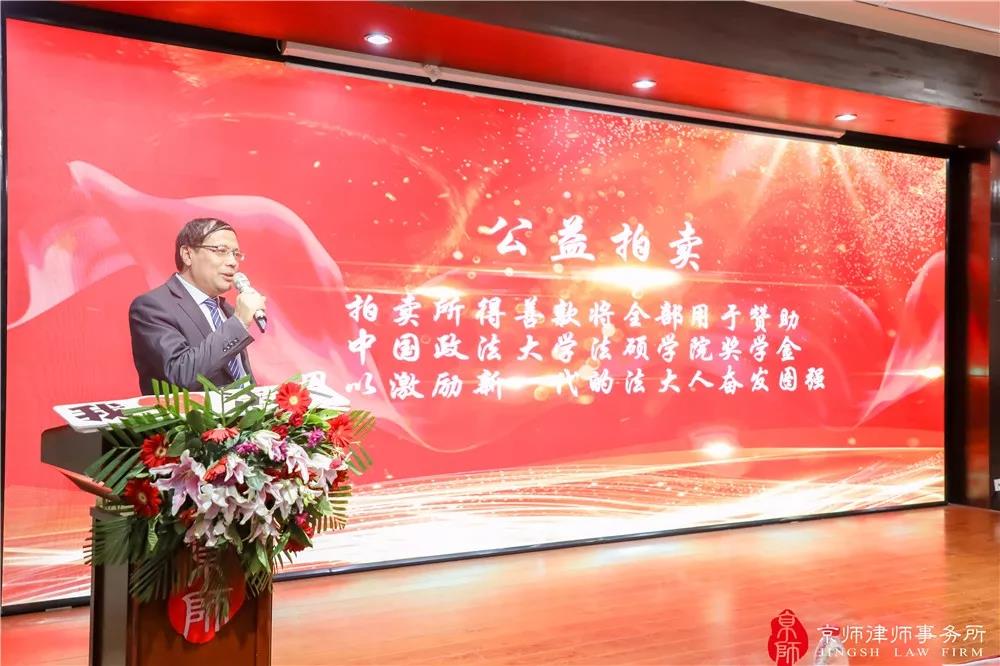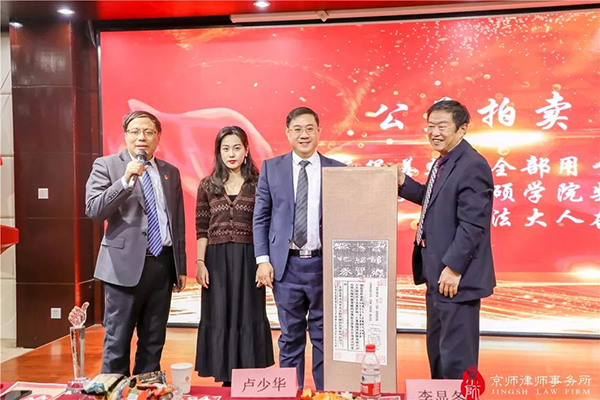 心归母校,践诺于行。在刘志民律师的主持下,本次盛典进入了公益拍卖环节。校友们积极捐出拍品,又勇跃地参与竞拍,现场竞拍十分火热,当上台领取拍品时,都畅谈了要为母校贡献一份爱心,为母校贡献一份力量,充分体现了,"一日入校门,终身法大人"的真挚情感。盛典通过现场公益拍卖共计筹得助学基金三万余元,捐赠图书90余册本,拍品全部来自法大校友的捐赠,拍卖所得,也将全部用于赞助中国政法大学法硕学院奖学金,用以激励新一代法大人奋发图强。