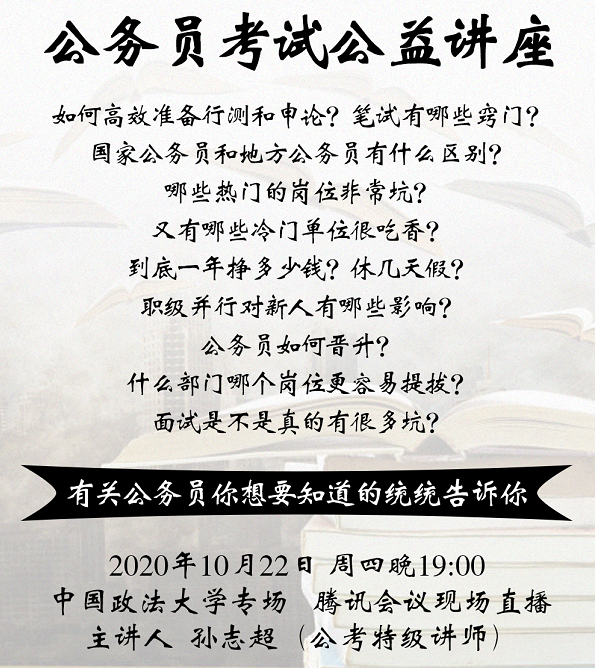 进入求职季,为了进一步帮助应届毕业生做好职业规划,学院邀请博远天合教育的创始人、公考面试特级讲师孙志超老师,于10月22日晚7点—9点在腾讯会议开设了一场关于公务员行业解析及国考报岗指导方面的线上公益讲座。孙老师曾多次来到法硕学院为毕业生做与公务员相关的职业规划指导,因满满干货得到广泛好评。本次讲座由院团委书记苏宇老师主持,2019级辅导员吴荻老师全程参加。